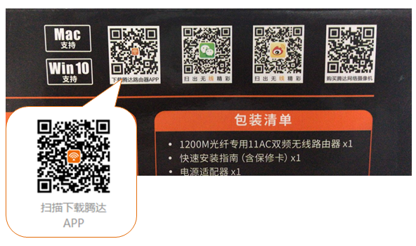 首先你的路由器包装包括路由器产品机身都可能会贴有一个APP的下载二维码。 以腾达或TPlink为例。 腾达的APP二维码下载在产品包装盒上就有